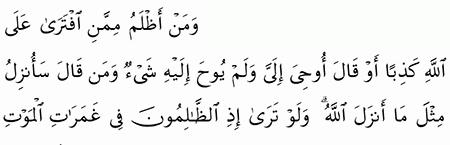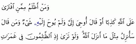 ومن اظلم ممن افترى على الله كذبا وقال اوحي. و م ن أ ظ ل م م م ن اف ت ر ى ع ل ى الل ه ك ذ با أ و ق ال أ وح ي إ ل ي و ل م ي وح إ ل ي ه ش ي ء و م ن ق ال س أ ن ز ل م ث ل م ا أ ن ز ل الل ه. نـزلت في مسيلمة أخي بني عدي بن حنيفة فيما كان يسجع ويتكهن به. و م ن أ ظ ل م م م ن اف ت ر ى ع ل ى الل ه ك ذ ب ا أ و ق ال أ و ح ي إ ل ي و ل م ي وح إ ل ي ه ايةش ي ء و م ن ق ال س أ نز ل م ث ل م ا أ ن زل الل ه و ل و ت ر ى إ ذ الظ ال م ون ف ي غ م ر ات. نزل قوله ومن أظلم ممن افترى على الله كذب ا أو قال أوحي إلي ولم يوح إليه شيء في مسيلمة وقوله.