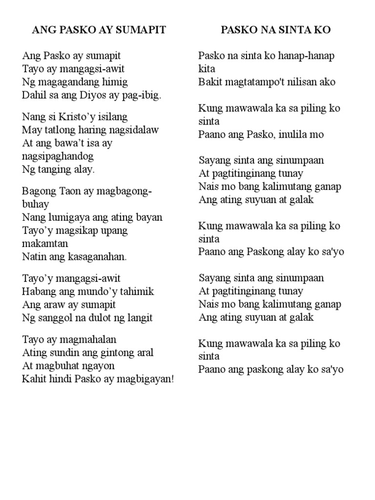 Kung mawawala ka sa piling ko sinta. Nais mo bang kalimutang ganap ang ating suyuan at galak. Pasko na sinta ko hanap hanap kita bakit nagtatampo t nilisan ako. Kung mawawala ka sa piling ko sinta paano ang paskong inulila mo.