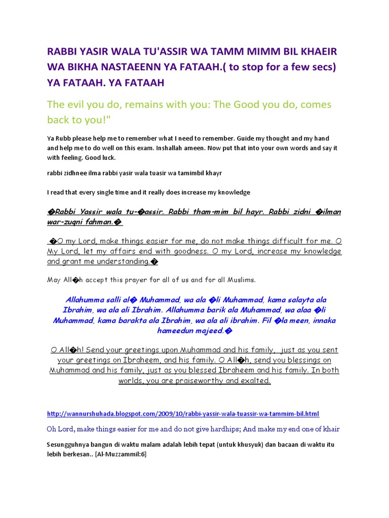 Rabbi yassir wala tu assir wa tammim bil khair. Rabbi yassir wala tu assir. O my lord make things easier for me do not make things difficult for me. Rabbi yassir wala tu assir rabbi tammim bil khair rabbi zidni ilman warzuqni fahman. Rabbi yassir wala tu assir rabbi tammim bi khair ya allah permudahkanlah jangan dipersulit.